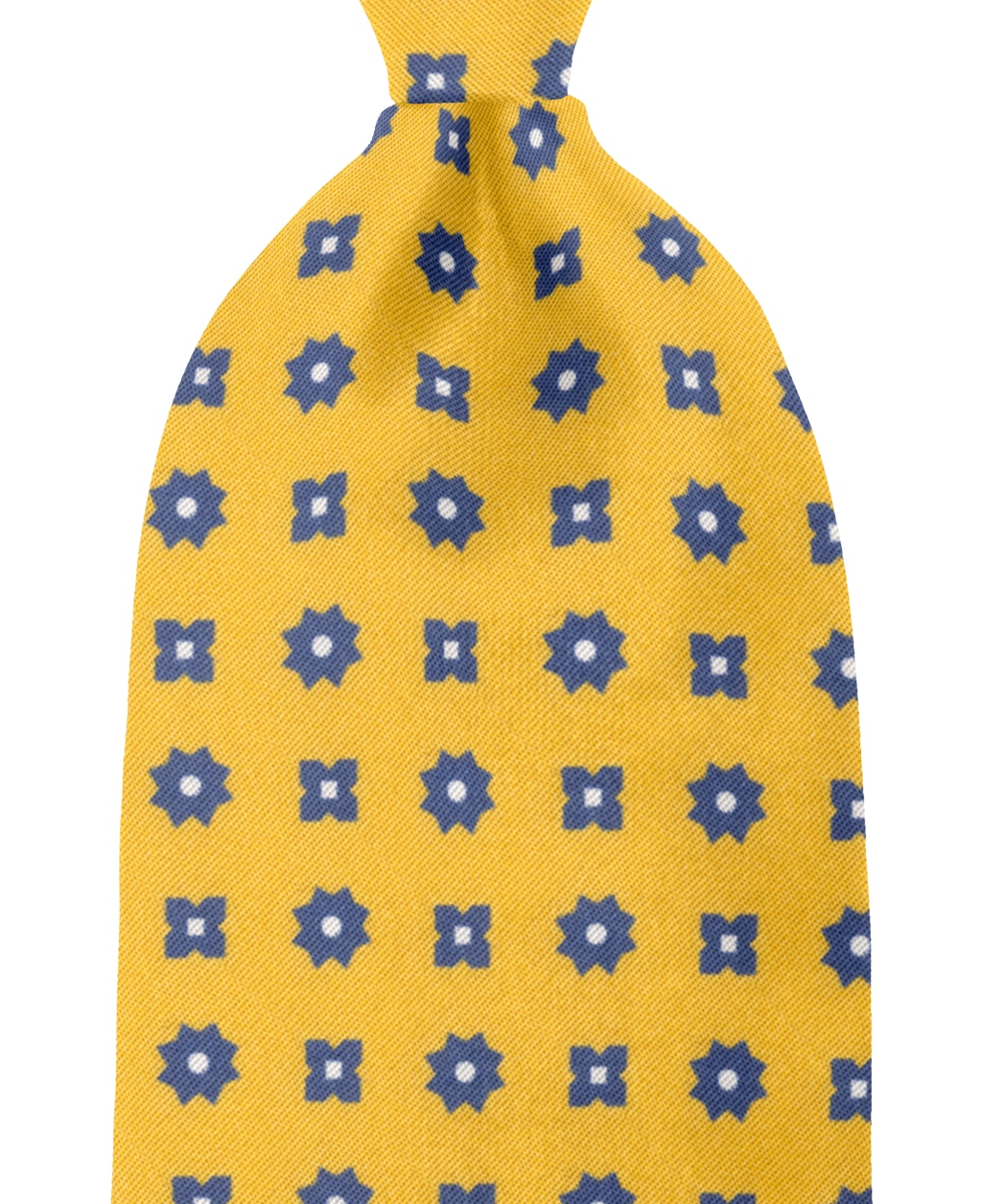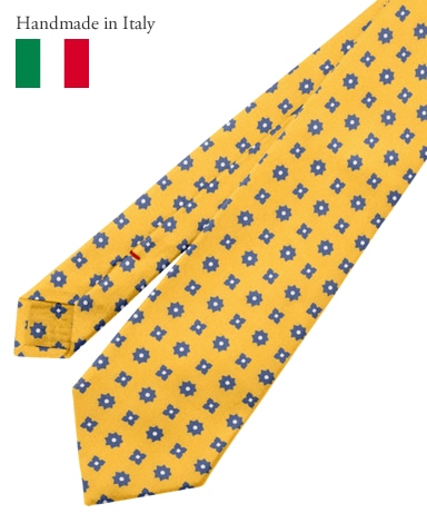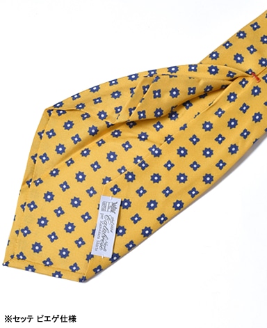 一枚の生地を折り畳んだようなかたちで作られるこだわりの「セッテピエゲ(7つ折り)」仕様。 英語では「セブンフォールド」とも呼ばれており、 通常のネクタイに比べ、倍近くのシルクを使う必要があるということだけでなく、熟練の技術を持つ職人による手作業を要します。 独特の柔らかみがあるスカーフのような仕上がりとエレガントな風合いはネクタイ通をうならせる出来栄えです。