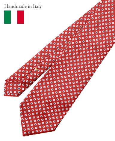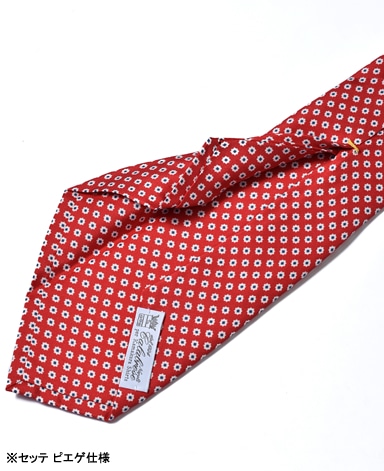 一枚の生地を折り畳んだようなかたちで作られるこだわりの「セッテピエゲ(7つ折り)」仕様。 英語では「セブンフォールド」とも呼ばれており、 通常のネクタイに比べ、倍近くのシルクを使う必要があるということだけでなく、熟練の技術を持つ職人による手作業を要します。 独特の柔らかみがあるスカーフのような仕上がりとエレガントな風合いはネクタイ通をうならせる出来栄えです。