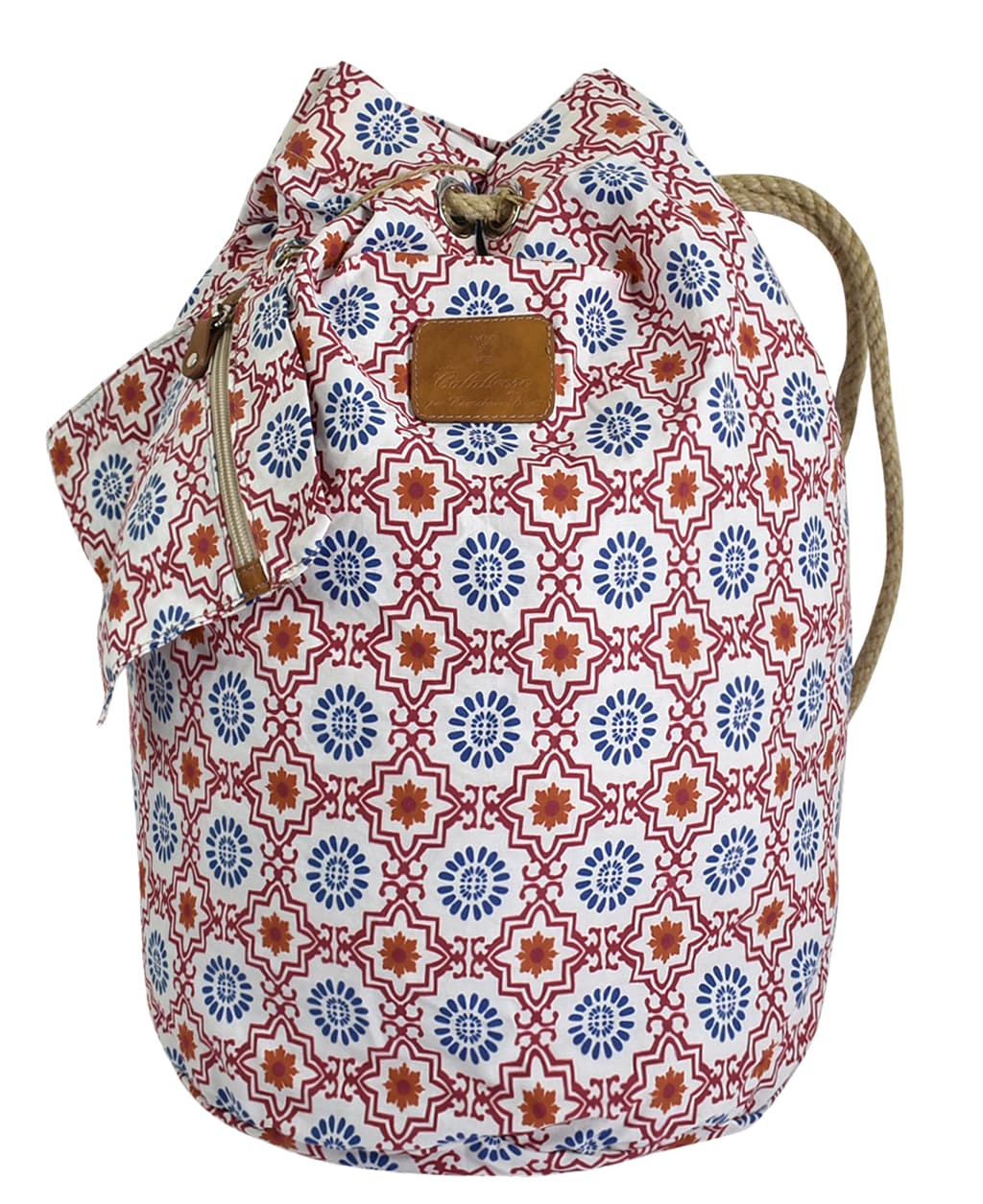 キャンバス地の爽やかで印象的な柄と色使い、麻縄のナチュラルな風合い、随所にイタリアンレザーのパーツを使用しており、 シンプルでありながら、イタリアならではのセンスが光るバッグです。 大容量のショルダーバッグはレジャーやカジュアルなシーンで重宝され、同柄の小物ポーチが付属します。 カラブレーゼならではのエレガントなデザインは男女問わずコーディネートにマッチします。