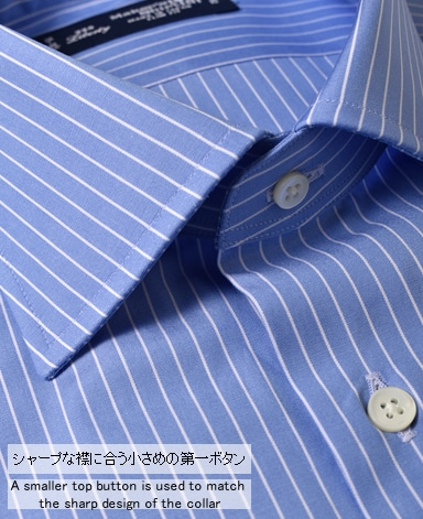 ■襟の表裏のパターンに差をつけ、コンパクトかつ構築的な襟を実現。品の良いドレスシャツの証である、首に巻きつくような内巻きフォルムは、匠によるいせ込み技術の成果です。