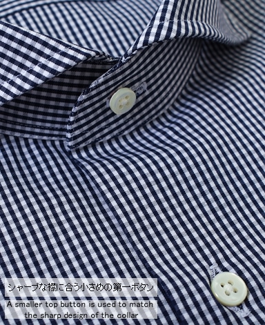 ■襟の表裏のパターンに差をつけ、コンパクトかつ構築的な襟を実現。品の良いドレスシャツの証である、首に巻きつくような内巻きフォルムは、匠によるいせ込み技術の成果です。