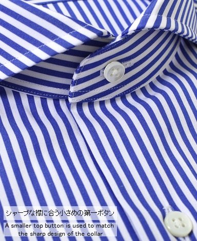 ■襟の表裏のパターンに差をつけ、コンパクトかつ構築的な襟を実現。品の良いドレスシャツの証である、首に巻きつくような内巻きフォルムは、匠によるいせ込み技術の成果です。