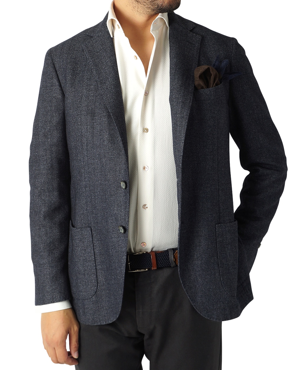 ウール×ポリエステルのジャケットはベージュとブルーをご用意。ウールパンツは勿論、コットンパンツにも相性は抜群です。