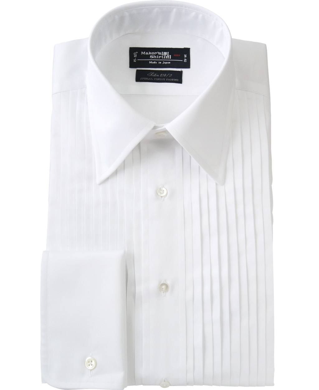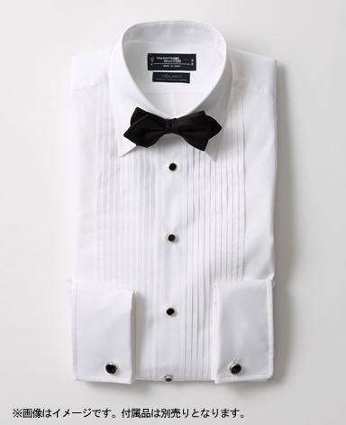 シャツ:プリーツ入りストレートカラー(又はウィングカラー)のフレンチカフスシャツ