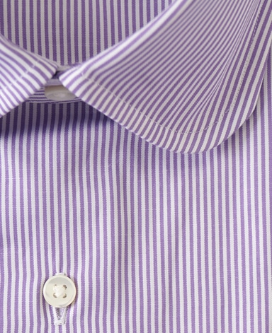 3枚目のシャツは、パープルストライプのラウンドカラーにダブルカフス。これはスタイルの最高潮。ラウンドカラーにダブルカフスを選ぶことでがダンディーな印象を与えつつ、生地は繊細なストライプだからオフィスにもぴったりの一枚です。ソリッドタイとグレースーツでパープルを際立たせ、シャツを主役にさせるのがベスト。ニュートラルカラーのスーツと落ち着いたグレー、ネイビー、パープル系のネクタイと合わせてみて下さい。-カマウ・ホステン