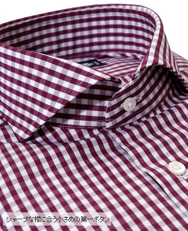 ■襟の表裏のパターンに差をつけ、コンパクトかつ構築的な襟を実現。品の良いドレスシャツの証である、首に巻きつくような内巻きフォルムは、匠によるいせ込み技術の成果です。