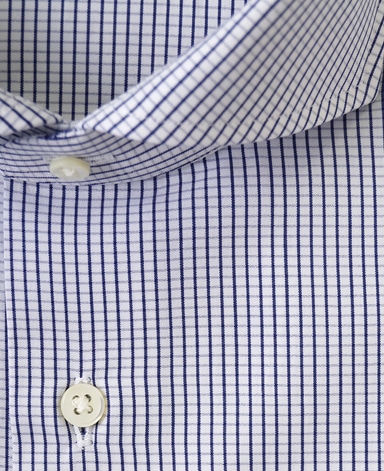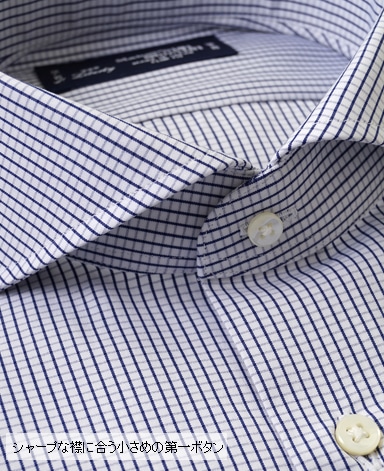■襟の表裏のパターンに差をつけ、コンパクトかつ構築的な襟を実現。品の良いドレスシャツの証である、首に巻きつくような内巻きフォルムは、匠によるいせ込み技術の成果です。