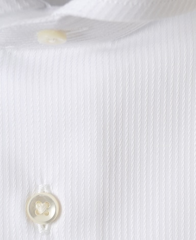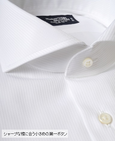 ■襟の表裏のパターンに差をつけ、コンパクトかつ構築的な襟を実現。品の良いドレスシャツの証である、首に巻きつくような内巻きフォルムは、匠によるいせ込み技術の成果です。