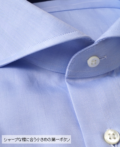 ■第一ボタンには、シャープな襟に合う小さめの9mmボタンを使用。