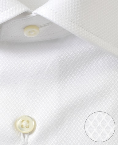 ■襟の表裏のパターンに差をつけ、コンパクトかつ構築的な襟を実現。品の良いドレスシャツの証である、首に巻きつくような内巻きフォルムは、匠によるいせ込み技術の成果です。