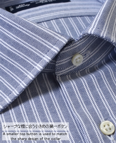 ■襟の表裏のパターンに差をつけ、コンパクトかつ構築的な襟を実現。品の良いドレスシャツの証である、首に巻きつくような内巻きフォルムは、匠によるいせ込み技術の成果です。