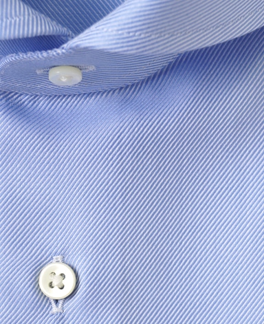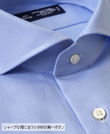 ■襟の表裏のパターンに差をつけ、コンパクトかつ構築的な襟を実現。品の良いドレスシャツの証である、首に巻きつくような内巻きフォルムは、匠によるいせ込み技術の成果です。