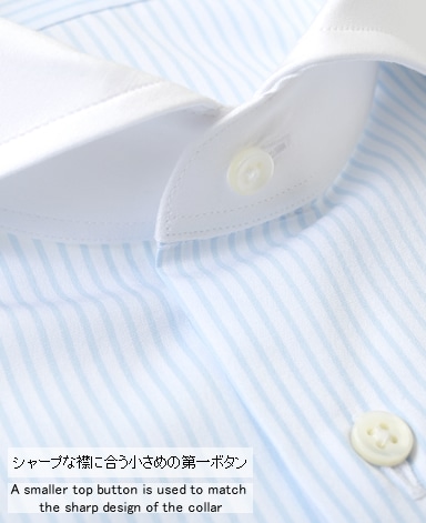 ■襟の表裏のパターンに差をつけ、コンパクトかつ構築的な襟を実現。品の良いドレスシャツの証である、首に巻きつくような内巻きフォルムは、匠によるいせ込み技術の成果です。