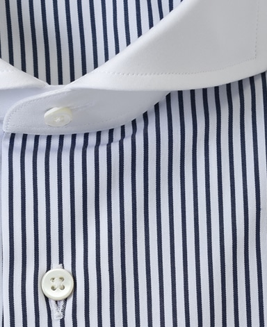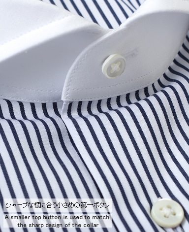 ■襟の表裏のパターンに差をつけ、コンパクトかつ構築的な襟を実現。品の良いドレスシャツの証である、首に巻きつくような内巻きフォルムは、匠によるいせ込み技術の成果です。