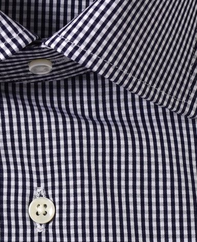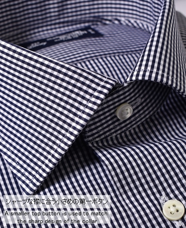 ■襟の表裏のパターンに差をつけ、コンパクトかつ構築的な襟を実現。品の良いドレスシャツの証である、首に巻きつくような内巻きフォルムは、匠によるいせ込み技術の成果です。