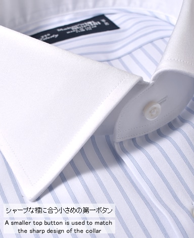 ■襟の表裏のパターンに差をつけ、コンパクトかつ構築的な襟を実現。品の良いドレスシャツの証である、首に巻きつくような内巻きフォルムは、匠によるいせ込み技術の成果です。