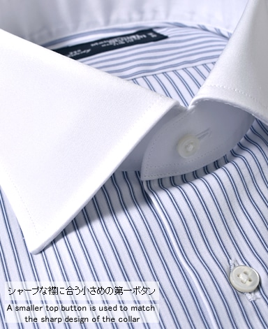■襟の表裏のパターンに差をつけ、コンパクトかつ構築的な襟を実現。品の良いドレスシャツの証である、首に巻きつくような内巻きフォルムは、匠によるいせ込み技術の成果です。