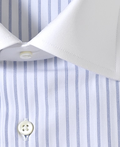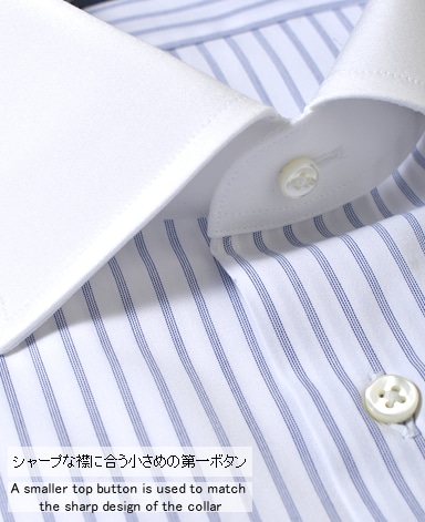 ■襟の表裏のパターンに差をつけ、コンパクトかつ構築的な襟を実現。品の良いドレスシャツの証である、首に巻きつくような内巻きフォルムは、匠によるいせ込み技術の成果です。