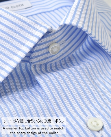 ■襟の表裏のパターンに差をつけ、コンパクトかつ構築的な襟を実現。品の良いドレスシャツの証である、首に巻きつくような内巻きフォルムは、匠によるいせ込み技術の成果です。