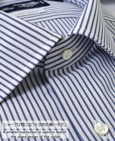 ■襟の表裏のパターンに差をつけ、コンパクトかつ構築的な襟を実現。品の良いドレスシャツの証である、首に巻きつくような内巻きフォルムは、匠によるいせ込み技術の成果です。