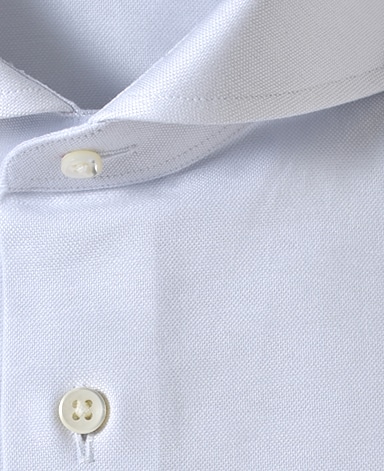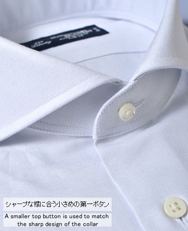 ■襟の表裏のパターンに差をつけ、コンパクトかつ構築的な襟を実現。品の良いドレスシャツの証である、首に巻きつくような内巻きフォルムは、匠によるいせ込み技術の成果です。