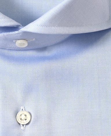 ■襟の表裏のパターンに差をつけ、コンパクトかつ構築的な襟を実現。品の良いドレスシャツの証である、首に巻きつくような内巻きフォルムは、匠によるいせ込み技術の成果です。