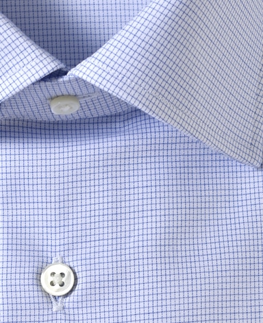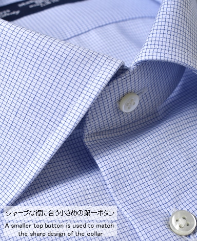 ■襟の表裏のパターンに差をつけ、コンパクトかつ構築的な襟を実現。品の良いドレスシャツの証である、首に巻きつくような内巻きフォルムは、匠によるいせ込み技術の成果です。