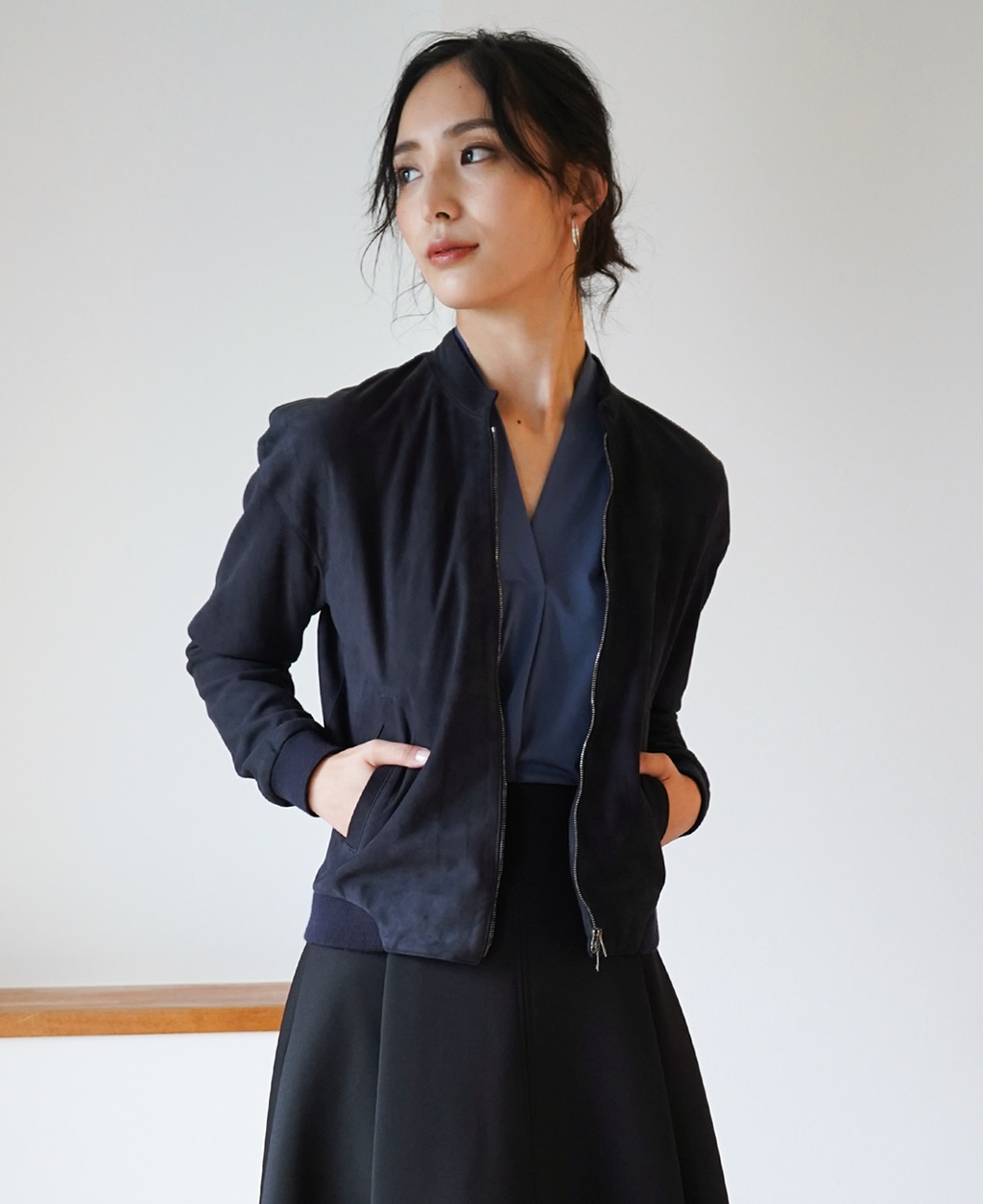 カジュアルなアイテムであるブルゾンが女性らしく色気のある雰囲気に。