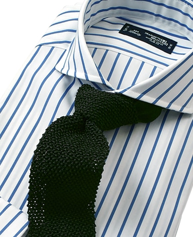 ■襟の表裏のパターンに差をつけ、コンパクトかつ構築的な襟を実現。品の良いドレスシャツの証である、首に巻きつくような内巻きフォルムは、匠によるいせ込み技術の成果です。