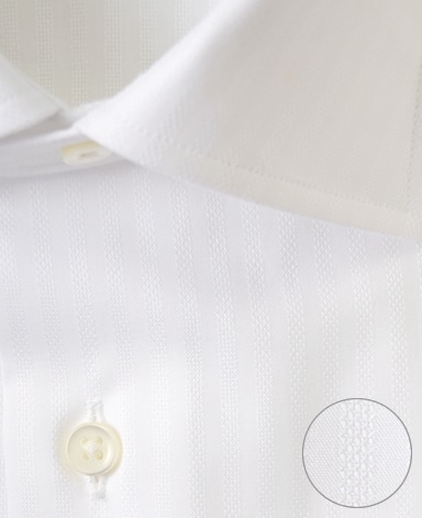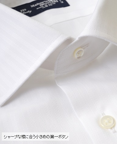 ■襟の表裏のパターンに差をつけ、コンパクトかつ構築的な襟を実現。品の良いドレスシャツの証である、首に巻きつくような内巻きフォルムは、匠によるいせ込み技術の成果です。