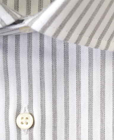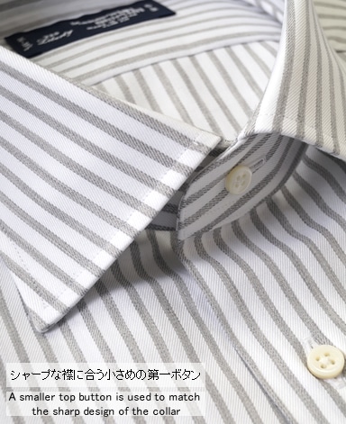 ■襟の表裏のパターンに差をつけ、コンパクトかつ構築的な襟を実現。品の良いドレスシャツの証である、首に巻きつくような内巻きフォルムは、匠によるいせ込み技術の成果です。