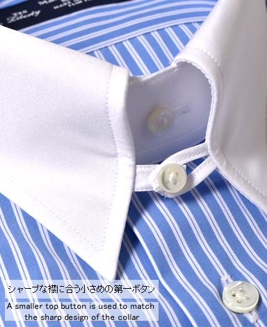 ■襟の表裏のパターンに差をつけ、コンパクトかつ構築的な襟を実現。品の良いドレスシャツの証である、首に巻きつくような内巻きフォルムは、匠によるいせ込み技術の成果です。