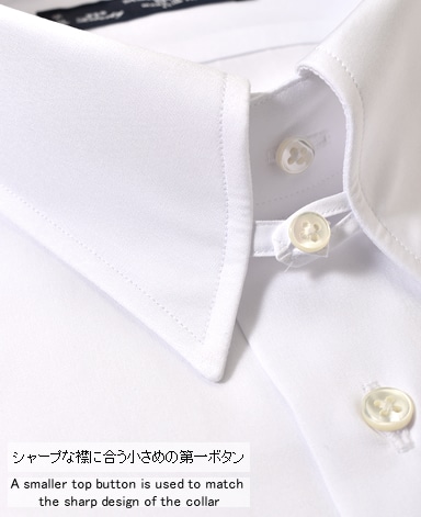■襟の表裏のパターンに差をつけ、コンパクトかつ構築的な襟を実現。品の良いドレスシャツの証である、首に巻きつくような内巻きフォルムは、匠によるいせ込み技術の成果です。