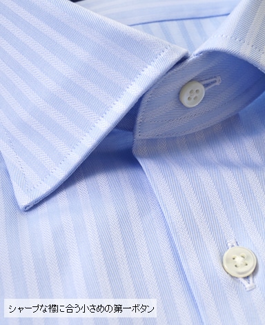 ■襟の表裏のパターンに差をつけ、コンパクトかつ構築的な襟を実現。品の良いドレスシャツの証である、首に巻きつくような内巻きフォルムは、匠によるいせ込み技術の成果です。