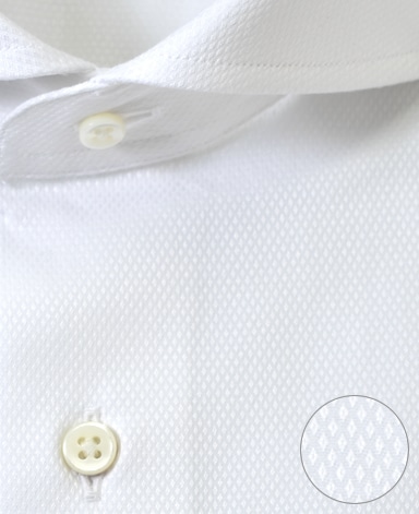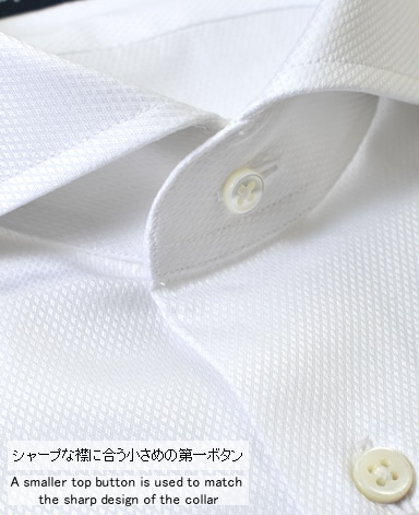 ■襟の表裏のパターンに差をつけ、コンパクトかつ構築的な襟を実現。品の良いドレスシャツの証である、首に巻きつくような内巻きフォルムは、匠によるいせ込み技術の成果です。