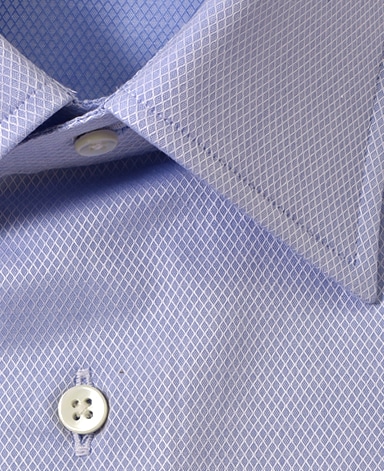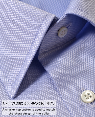 ■襟の表裏のパターンに差をつけ、コンパクトかつ構築的な襟を実現。品の良いドレスシャツの証である、首に巻きつくような内巻きフォルムは、匠によるいせ込み技術の成果です。