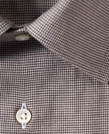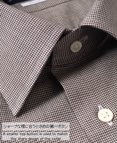 ■襟の表裏のパターンに差をつけ、コンパクトかつ構築的な襟を実現。品の良いドレスシャツの証である、首に巻きつくような内巻きフォルムは、匠によるいせ込み技術の成果です。