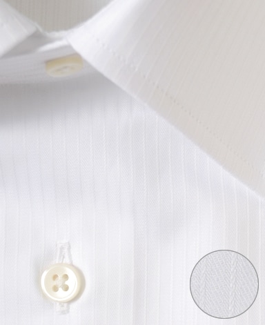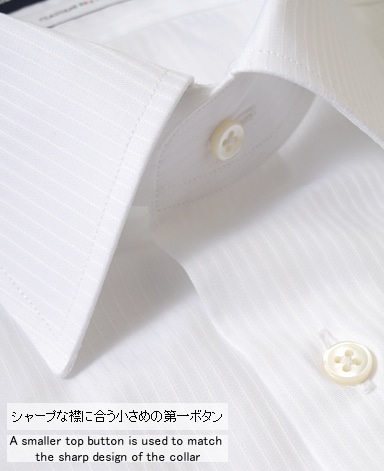 ■襟の表裏のパターンに差をつけ、コンパクトかつ構築的な襟を実現。品の良いドレスシャツの証である、首に巻きつくような内巻きフォルムは、匠によるいせ込み技術の成果です。