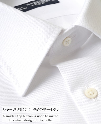■襟の表裏のパターンに差をつけ、コンパクトかつ構築的な襟を実現。品の良いドレスシャツの証である、首に巻きつくような内巻きフォルムは、匠によるいせ込み技術の成果です。