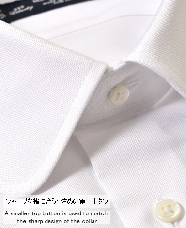 ■襟の表裏のパターンに差をつけ、コンパクトかつ構築的な襟を実現。品の良いドレスシャツの証である、首に巻きつくような内巻きフォルムは、匠によるいせ込み技術の成果です。