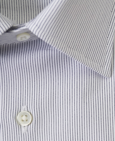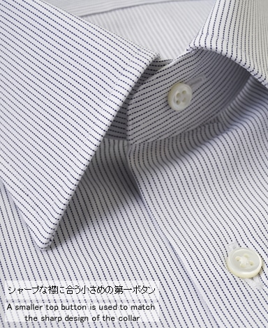 ■襟の表裏のパターンに差をつけ、コンパクトかつ構築的な襟を実現。品の良いドレスシャツの証である、首に巻きつくような内巻きフォルムは、匠によるいせ込み技術の成果です。