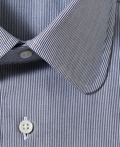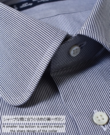 ■襟の表裏のパターンに差をつけ、コンパクトかつ構築的な襟を実現。品の良いドレスシャツの証である、首に巻きつくような内巻きフォルムは、匠によるいせ込み技術の成果です。