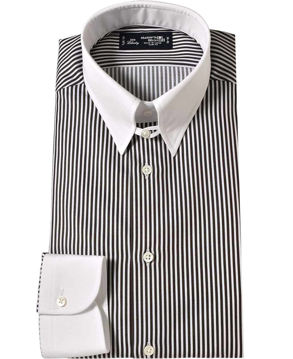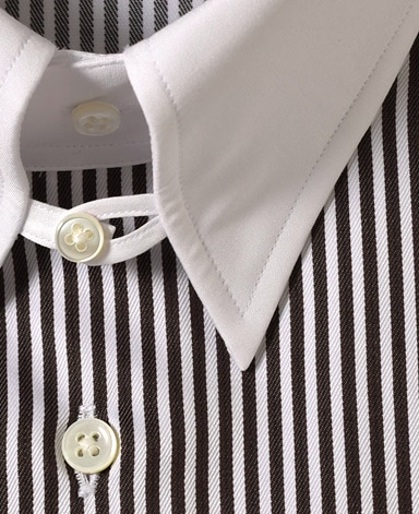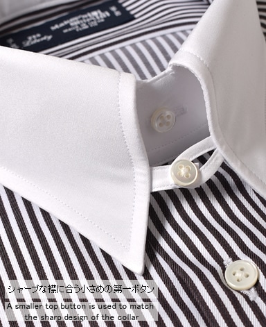 ■襟の表裏のパターンに差をつけ、コンパクトかつ構築的な襟を実現。品の良いドレスシャツの証である、首に巻きつくような内巻きフォルムは、匠によるいせ込み技術の成果です。