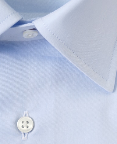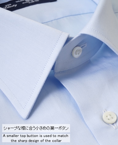 ■襟の表裏のパターンに差をつけ、コンパクトかつ構築的な襟を実現。品の良いドレスシャツの証である、首に巻きつくような内巻きフォルムは、匠によるいせ込み技術の成果です。