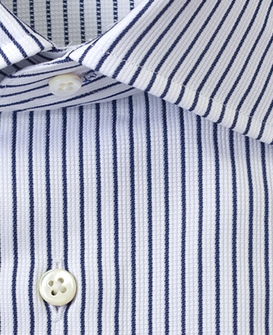 通常針目は3cmに18針以上で高級とされていますが、私たちのシャツは21針で縫い上げられています。また、耐久性に優れた「巻き伏せ本縫い」でシャツを仕立てています。