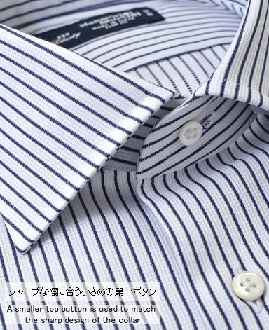 ■襟の表裏のパターンに差をつけ、コンパクトかつ構築的な襟を実現。品の良いドレスシャツの証である、首に巻きつくような内巻きフォルムは、匠によるいせ込み技術の成果です。
