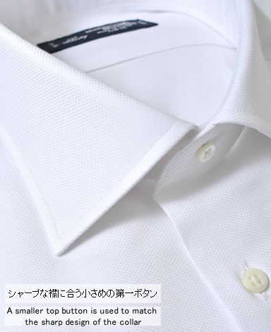■襟の表裏のパターンに差をつけ、コンパクトかつ構築的な襟を実現。品の良いドレスシャツの証である、首に巻きつくような内巻きフォルムは、匠によるいせ込み技術の成果です。