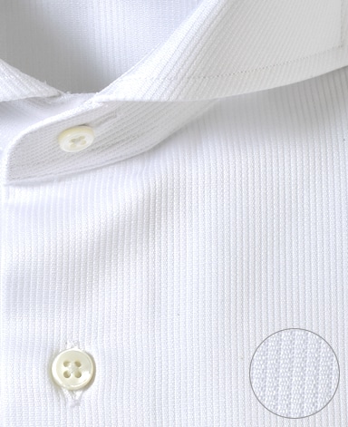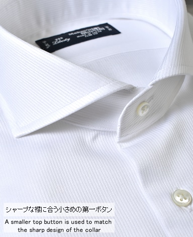 ■襟の表裏のパターンに差をつけ、コンパクトかつ構築的な襟を実現。品の良いドレスシャツの証である、首に巻きつくような内巻きフォルムは、匠によるいせ込み技術の成果です。