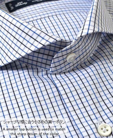 ■襟の表裏のパターンに差をつけ、コンパクトかつ構築的な襟を実現。品の良いドレスシャツの証である、首に巻きつくような内巻きフォルムは、匠によるいせ込み技術の成果です。