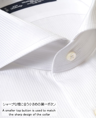 ■襟の表裏のパターンに差をつけ、コンパクトかつ構築的な襟を実現。品の良いドレスシャツの証である、首に巻きつくような内巻きフォルムは、匠によるいせ込み技術の成果です。
